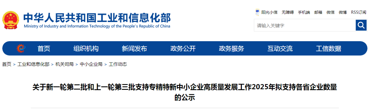 為深入貫徹習近平總書記關于促進中小企業專精特新發展的重要指示精神,按照《財政部 工業和信息化部關于進一步支持專精特新中小企業高質量發展的通知》(財建〔2024〕148號)和《關于開展第三批第二年財政支持專精特新“小巨人”企業高質量發展績效評價工作的函》(工企業函〔2025〕27號),現將新一輪第二批和上一輪第三批支持專精特新中小企業高質量發展工作2025年擬支持各省企業數量向社會公示,公示時間為5月30日-6月6日。
