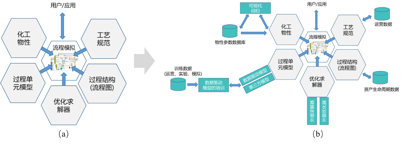化工流程模擬軟件同樣向平臺化發(fā)展。化工流程模擬軟件應(yīng)用于工藝設(shè)計(jì)、虛擬開車、操作員培訓(xùn)、生產(chǎn)優(yōu)化等工廠全生命周期。經(jīng)過40多年發(fā)展,領(lǐng)先供應(yīng)商的產(chǎn)品已經(jīng)集成穩(wěn) 態(tài)模擬與動態(tài)模擬、集成煉油模擬與化工模擬,主要包括5大功能模塊,即工藝規(guī)范、過程結(jié)構(gòu)(流程圖) 、優(yōu)化求解器、過程單元模型和化工物性,如圖2a所示,并通過CAPE- OPEN軟件接口標(biāo)準(zhǔn)促進(jìn)了通用流程模擬軟件平臺與單元模型、熱力學(xué)模型組件間的互操作。未來,化工流程模擬平臺軟件的5大模塊將進(jìn)一步融合生產(chǎn)實(shí)時數(shù)據(jù)、實(shí)驗(yàn)數(shù)據(jù)、資產(chǎn)生命周期數(shù)據(jù),進(jìn)一步集成第三方求解器、優(yōu)化器、大數(shù)據(jù)模型、專用反應(yīng)器模型、物性數(shù)據(jù)庫等,為打造石化工藝數(shù)字孿生提供平臺化支撐,如圖 2b)所示。