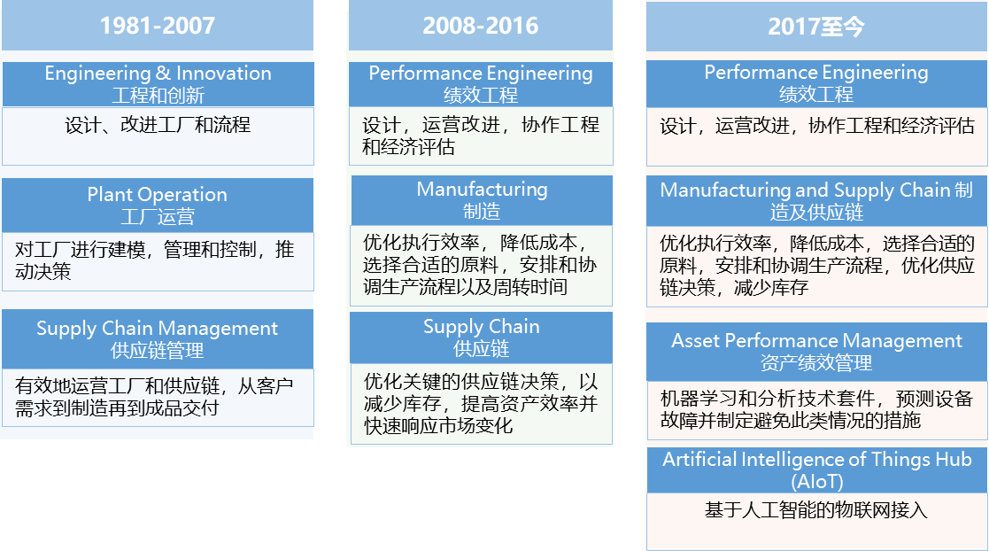 并購發(fā)展階段:從 1996 年起,艾斯本收購了超過 25 個領(lǐng)域中最優(yōu)秀的公司,打造了涵蓋績效工程、制造與供應(yīng)鏈、資產(chǎn)績效管理三大類軟件的產(chǎn)品線,廣泛應(yīng)用于能源、化工、制藥、工程設(shè)計(jì)以及其他采用化學(xué)工藝生產(chǎn)產(chǎn)品的行業(yè),如圖 3 所示。這與艾斯本從流程模擬、優(yōu)化到人工智能的業(yè)務(wù)發(fā)展邏輯保持同步。202110 月,艾默生以 60 億美元現(xiàn)金獲得艾斯本55% 的多數(shù)股權(quán),并將旗下 OSI 公司的電力軟件和地質(zhì)建模軟件業(yè)務(wù)并入艾斯本業(yè)務(wù)中。