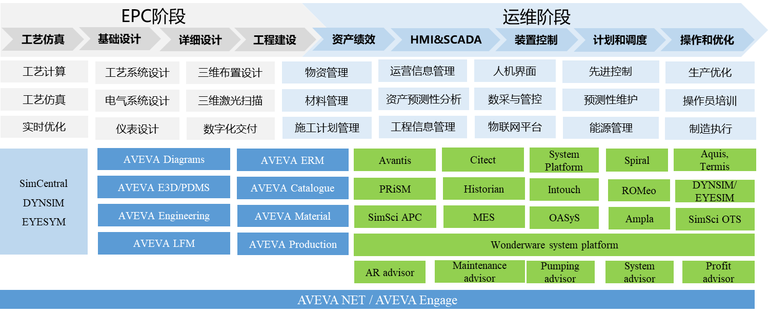 施耐德于2014年收購英維斯(Invesys),2017 年反向收購劍維,并將英維斯的業(yè)務(wù)與劍維整合。原來英維斯的軟件,包括用于化工流程模擬的 PRO/II、用于換熱設(shè)備和網(wǎng)絡(luò)優(yōu)化的HEXTRAN、用于動態(tài)過程模擬的 DYNSIM、用于在線實(shí)時優(yōu)化的ROMeo等,現(xiàn)在都集成在劍維品牌下,形成了工程設(shè)計(jì)集成平臺AVEVA E3DIE&D、流程模擬平臺軟件、資產(chǎn)績效管理套件,提供從工程設(shè)計(jì)、工程建設(shè)、數(shù)字化交付到生產(chǎn)運(yùn)營全生命周期的解決方案,如圖 4 所示。
