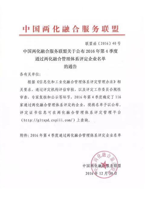 2016年第4季度通過兩化融合管理體系評定的企業名單