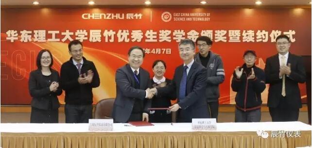 2017年4月7日下午,華東理工大學辰竹優秀生獎學金頒獎暨續約儀式在華東理工大學徐匯校區逸夫樓演講廳舉行。華東理工大學信息學院黨委書記侍洪波、黨委副書記劉志鵬、副院長萬永菁、自動化系副系主任王華忠、自動化系教授吳勤勤以及相關輔導員一同與會;上海辰竹儀表有限公司董事長兼總經理王竹平先生、戰略發展部經理李丹萍、研發經理倪敏等出席頒獎儀式。頒獎儀式由華東理工大學劉志鵬主持。