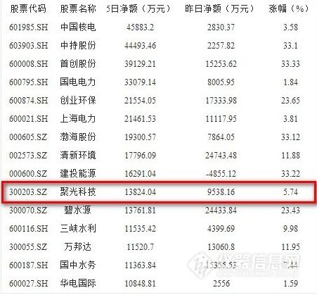 具體數據顯示,中國核電(601985)、中持股份(603903)、首創股份(600008)、國電電力(600795)、創業環保(600874)、上海電力(600021)等6股大單凈流入逾2億元,凈流入金額分別為4.59億元、 4.45億元、3.91億元、3.31億元、2.16億元、2.15億元。上述6股外,本周大單凈流入逾億元的個股還有渤海股份(000605)、清新環境(002573)、建投能源(000600)、聚光科技(300203)、碧水源(300070)、三峽水利(600116)、萬邦達(300055)、國中水務(600187)、華電國際(600027)等9只個股。