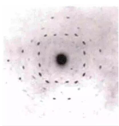 大約在 1912 年 1 月底,德國物理學(xué)家索末菲 (A. Sommerfeld,1868~1951) 的一位學(xué)生厄瓦爾德 (P. Ewald) 在準備博士論文過程中,為研究光波在晶格中 的行為而尋找數(shù)學(xué)處理方法時遇到了一些困難,為此 他向勞厄 (M. Laue)( 見圖 6) 請教。在他們的探討中勞 厄了解到晶體中原子間的距離很小,與可見光的波長 相比大概只有波長的 1/500 或 1/1000。勞厄想到,雖然人工做不出這樣細的光柵,但自然界中的晶體也許能行。晶體是一種幾何形狀整齊的固體,而在固體平 面之間有特定的角度,并且有特定的對稱性。這種規(guī)律是構(gòu)成晶體結(jié)構(gòu)的原子有次序地排列的結(jié)果。一層原子和另一層原子之間的距離大約是 X 射線波長的大小。如果這樣,晶體應(yīng)能使 X 射線衍射。勞厄醞釀出一個實驗:把晶體當作一個三維光柵,讓一束 X 射 線穿過,由于空間光柵的間距與 X 射線波長的估計值在數(shù)量級上近似,可期望觀察到衍射譜。雖然勞厄的想法受到索末菲和維恩 (W. Wien) 等著名物理學(xué)家的懷疑,但是在索末菲的助手弗里德里希 (W. Friedrich) 和倫琴的博士研究生克尼平 (P. Knipping) 的支持和參與下,他們終于成功地觀察到 X 射線透過硫酸銅后的衍射斑點。通過改進儀器設(shè)備數(shù)周后他們照出更為清晰的 ZnS、PbS 和 NaCl 等晶體的 X 射線衍射圖 ( 如 圖 7 所示 )。