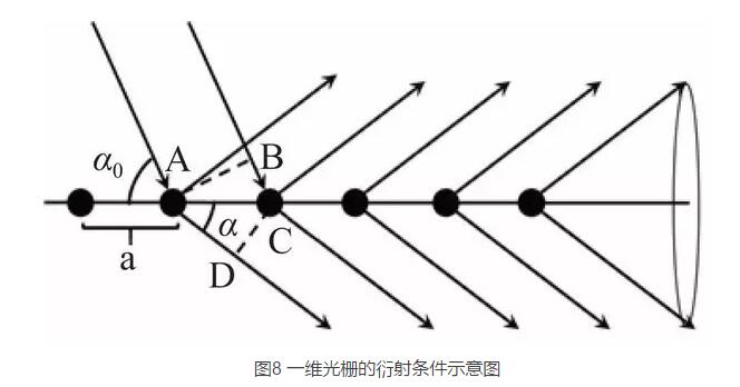 這里先討論一維光柵,如圖 8 所示,當光入射到光柵常數(shù)為 a 的一維光柵時,光將發(fā)生衍射。形成衍射極大 ( 即亮條紋 ) 的條件是光程差為波長的整數(shù) 倍。由圖 8 可知相鄰衍射光線的光程差為距離為 BCAD,由此可得一維光柵衍射的理論公式: