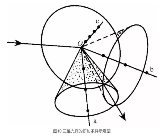 如圖10 所示,此時形成亮斑的條件是三個滿足公式(3) 的那些三個方向上圓錐面的交線。(3) 式即為描述晶體X 射線衍射的勞厄方程。式中 a,b,c 分別為三