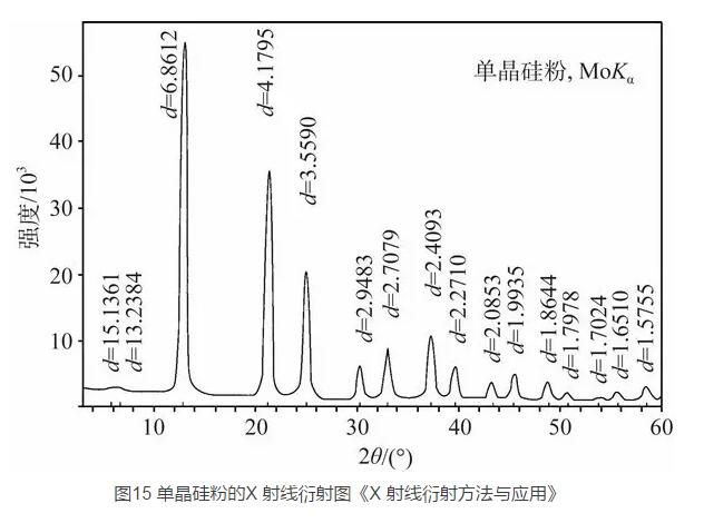 現(xiàn)代的 X 射線衍射儀的原理如圖 14 所示,從 X 射線管射出的 X 射線經(jīng)準直后照射在樣品上;在測量 過程中樣品在計算機的控制下勻速轉(zhuǎn)動,其入射角以 一定的角速度變化,測量衍射光強的探測器則以 2 倍于入射角的角速度變化;由此來記錄衍射光強隨入射角的變化,從而測出各個晶面間的面間距。圖 15 給 出了比較典型的粉末晶體 Si 的 X 衍射圖,每一個衍射峰對應(yīng)一簇晶面的面間距,通過計算機與已知晶體的衍射資料庫進行比對即可確定樣品是什么晶體,或者發(fā)現(xiàn)新的晶體。