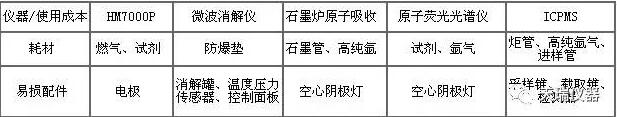 HM7000P在樣品處理和測試過程中,除需要使用燃氣、試劑外,無需其它耗材,且易損配件少,同時HM-7000P無需外接電源。而微波在使用過程中需外接高壓電源,功率高、耗電量大,且高溫消解罐、溫度壓力傳感器、防爆墊皆為易損耗材,價格昂貴,即使用成本高。下表1為HM7000P與其它實驗室設備的使用成本比對。