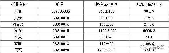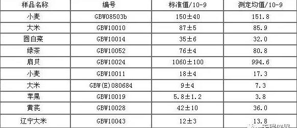選取包含糧食、蔬菜等眾多種類的食品國家標準樣品,采用HM-7000P進行樣品處理并測定,測試結果如表4~6所示: