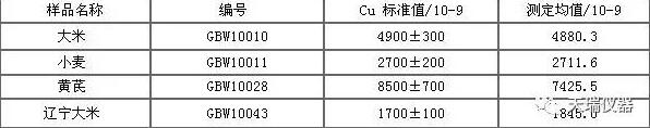 從表4~6的測試數據可以看出:采用本方法測定重金屬鎘、鉛濃度低于國標限量濃度的食品國家標準樣品,測試結果的準確度為80%-120%,方法檢出限為鎘:0.5μg/kg;鉛:1.0μg/kg;銅:0.5μg/kg。