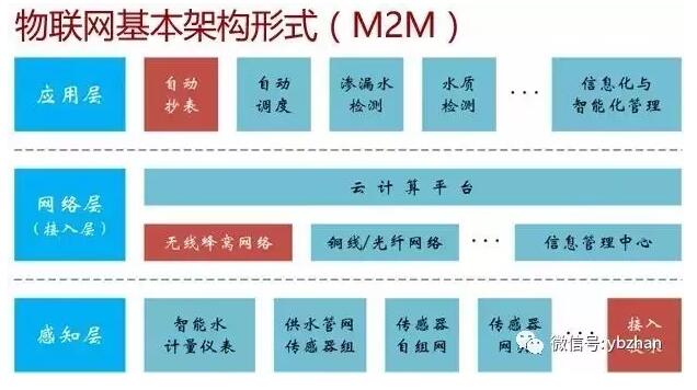 大家都知道,互聯網的基本架構,是人與人的信息交互。而物聯網,是M2M,就是機器與機器之間的交互。目前簡單的劃分,可以將其分成三個層次,最下面的是感知層,即儀表和傳感器,網絡層是解決數據安全傳輸的問題,應用層將采集到的數據進行業務處理等。