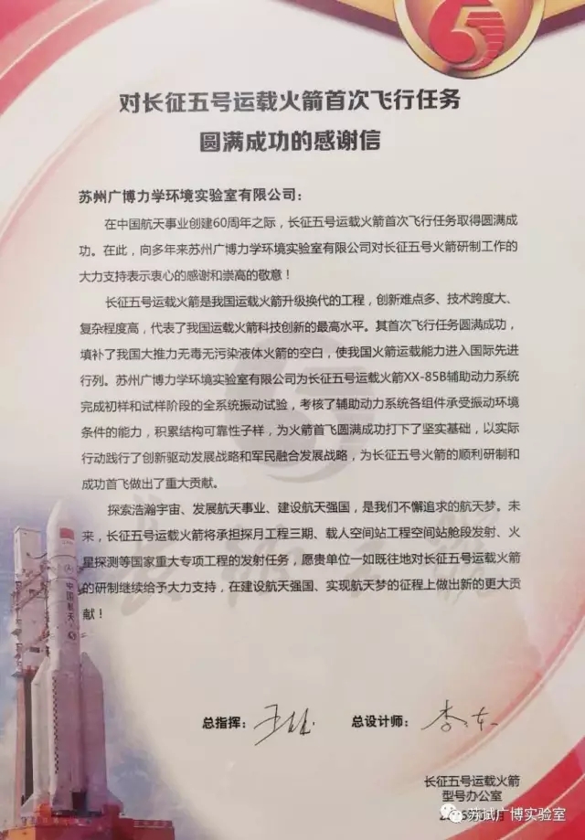 長(zhǎng)征五號(hào)運(yùn)載火箭是我國(guó)運(yùn)載火箭升級(jí)換代的工程,創(chuàng)新難點(diǎn)多、技術(shù)跨度大、復(fù)雜程度高,代表了我國(guó)運(yùn)載火箭科技創(chuàng)新的最高水平。其首次飛行任務(wù)圓滿(mǎn)成功,填補(bǔ)了我國(guó)大推力無(wú)毒無(wú)污染液體火箭的空白,使我國(guó)火箭運(yùn)載能力進(jìn)入國(guó)際先進(jìn)行列。蘇州蘇試廣博環(huán)境可靠性實(shí)驗(yàn)室有限公司為長(zhǎng)征五號(hào)運(yùn)載火箭XX-85B輔助動(dòng)力系統(tǒng)完成初樣和試驗(yàn)階段的全系統(tǒng)振動(dòng)試驗(yàn),考核了輔助動(dòng)力系統(tǒng)各組件承受振動(dòng)環(huán)境條件的能力,積累結(jié)構(gòu)可靠性子樣,為火箭首飛圓滿(mǎn)成功打下了堅(jiān)實(shí)基礎(chǔ),以實(shí)際行動(dòng)踐行了創(chuàng)新驅(qū)動(dòng)發(fā)展戰(zhàn)略和軍民融合發(fā)展戰(zhàn)略,為長(zhǎng)征五號(hào)火箭的順利研制和成功首飛做出了重大貢獻(xiàn)。