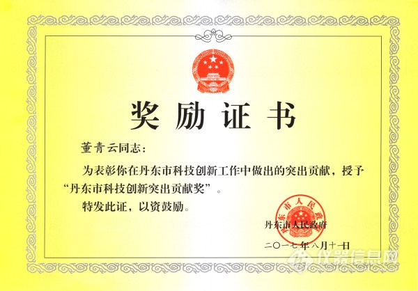 2017年8月22日丹東市召開全市科技創新大會,會上宣讀了表彰決定。丹東百特儀器有限公司獲得“丹東市十佳高新技術企業”稱號,總經理董青云獲得“丹東市科技創新突出貢獻獎”,基準法環境空氣顆粒物PM2.5和PM10自動監測儀項目獲“丹東市科技進步一等獎”,成為本次科技創新大會唯一獲得三項大獎的企業。
