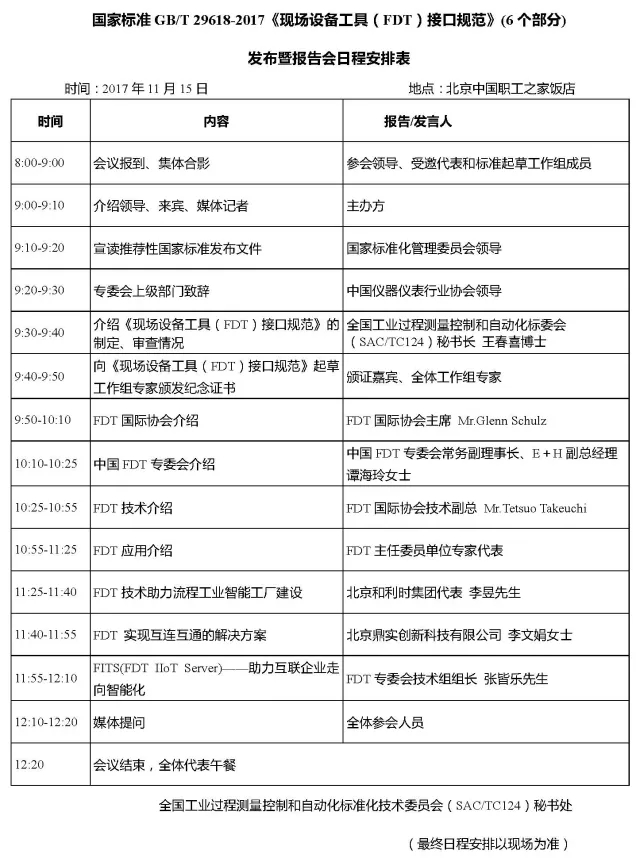 2017年11月15日,國家標(biāo)準(zhǔn)GB/T 29618-2017現(xiàn)場設(shè)備工具(FDT)接口規(guī)范 (6個部分)發(fā)布暨報告會將在北京舉行。本次發(fā)布會將由全國工業(yè)過程測量控制和自動化標(biāo)準(zhǔn)化技術(shù)委員會(SAC/TC124)主辦,機(jī)械工業(yè)儀器儀表綜合技術(shù)經(jīng)濟(jì)研究所(ITEI)承辦,中國儀器儀表行業(yè)協(xié)會,FDT專業(yè)委員會和西南大學(xué)協(xié)辦。