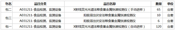 湖南省糧食局 糧食重金屬快速檢測(cè)設(shè)備(第二批)采購預(yù)算為2760萬元,分為三包,采購明細(xì)如下表所示。