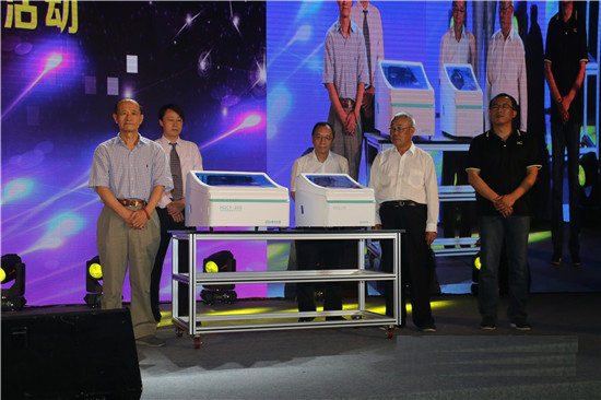 本次慶祝活動(dòng)上,海光公司隆重發(fā)布HGAF-900系列原子熒光光度計(jì)、HGCF系列全自動(dòng)連續(xù)流動(dòng)分析儀兩款分析儀器。清華大學(xué)鄧勃教授、地礦部物探研究所張錦茂研究員、海光公司第四任總經(jīng)理劉明鐘、中國(guó)儀器儀表學(xué)會(huì)分析儀器分會(huì)榮譽(yù)理事長(zhǎng)閆成德、原地礦部科技司周金生處長(zhǎng)、中國(guó)儀器儀表學(xué)會(huì)常務(wù)副秘書(shū)長(zhǎng)張彤、中國(guó)儀器儀表行業(yè)協(xié)會(huì)專(zhuān)職副理事長(zhǎng)李躍光、中國(guó)環(huán)境監(jiān)測(cè)總站齊文啟研究員、海光公司原子熒光事業(yè)部經(jīng)理梁敬、海光公司流動(dòng)分析事業(yè)部經(jīng)理宮博共10位嘉賓為新品揭幕。