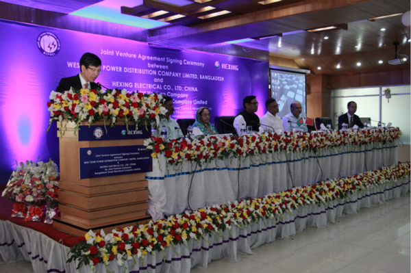 孟加拉國國家能源部長Nasrul Hamid先生等政要一行見證了簽字儀式。海興電力董事長周良璋先生和WZPDCL秘書Abdul Motaleb先生分別代表雙方在協(xié)議上簽字,并表示接下來將齊心協(xié)力籌備與建設好名為"Bangladesh Smart Electrical Company Limited"(孟加拉智能電力設備有限公司)的合資企業(yè)。其中WZPDCL和海興電力分別以51:49的比例認購了新公司的股本。
