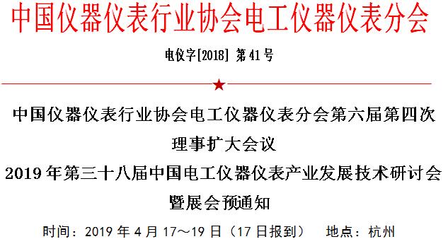 中國儀器儀表行業協會電工儀器儀表分會定于 2019 4月在杭州召開“2019 第三十八屆中國電工儀器儀表產業發展技術研討會暨展會,同期召開中國儀器儀表行業協會電工儀器儀表分會第六屆第四次理事擴大會議