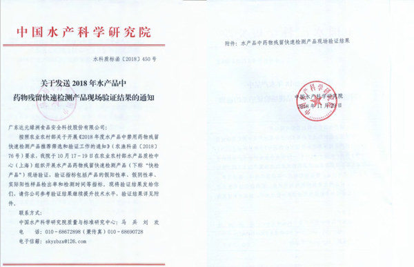 2018年10月17-19日,廣東達元綠洲食品安全科技股份有限公司參加了由農業農村部漁業漁政管理局主辦,中國水產科學研究院承辦的“2018年水產品中藥物殘留快檢產品的驗證”工作,食安科技生產的孔雀石綠快速檢測盒等3項產品全部通過驗證!