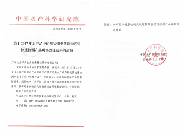 值得一提的是,此前,在2017年水產品中硝基呋喃類代謝物殘留快速檢測產品驗證中,食安科技生產的硝基呋喃代謝物快速檢測盒等4種快檢產品也全部通過驗證。