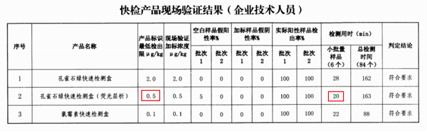 食安科技參與本次驗證的產品有孔雀石綠快速檢測盒、孔雀石綠快速檢測盒(熒光層析)以及氯霉素快速檢測盒?,F場驗證期間,技術人員使用2個批號快檢產品現場檢測84個魚糜樣品,評判結果表示食安科技驗證的產品全部符合評價標準要求!值得注意的是,孔雀石綠快速檢測盒(熒光層析)產品標識最低檢出限為0.5μg/kg,檢測用時僅為20min,具備高效高靈敏度的特點,為全場檢出限度最低用時最短的產品!