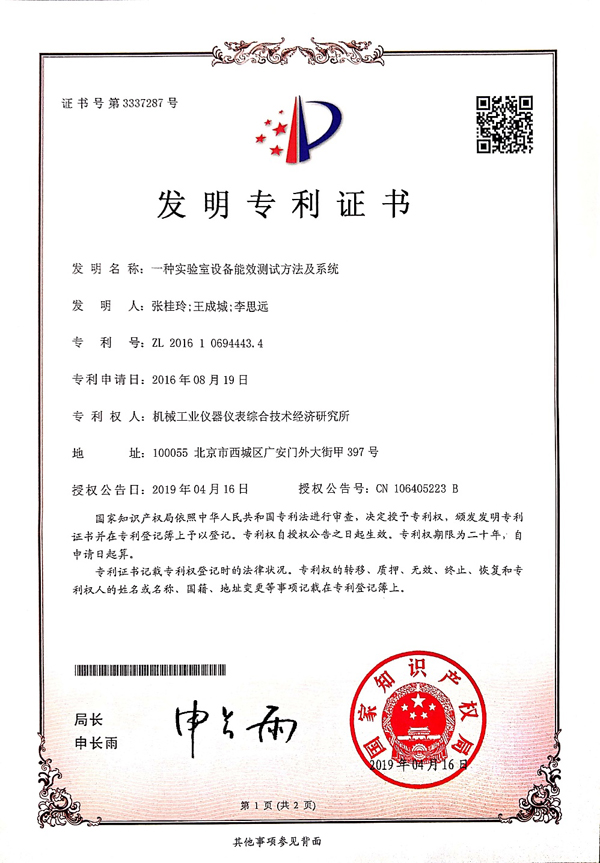 機(jī)械工業(yè)儀器儀表綜合技術(shù)經(jīng)濟(jì)研究所標(biāo)準(zhǔn)與檢測(cè)中心張桂玲高工帶領(lǐng)“實(shí)驗(yàn)室儀器設(shè)備”研究團(tuán)隊(duì)申請(qǐng)的“一種實(shí)驗(yàn)室設(shè)備能效測(cè)試方法及系統(tǒng)”發(fā)明專利近日獲得國(guó)家知識(shí)產(chǎn)權(quán)局授權(quán),專利號(hào):ZL201610694443.4。