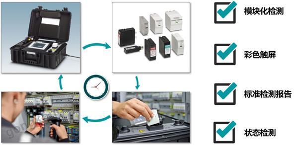 以小菲為代表的全球知名電涌保護器生產商會向客戶提供可攜帶的檢測設備,對現(xiàn)場的SPD進行質量檢查。這一類檢測設備內置微型沖擊發(fā)生器,能夠較為精準地判斷產品的好壞。菲尼克斯電氣Checkmaster2產品能夠對菲家所有可插拔電涌保護器進行現(xiàn)場檢測,方便快捷。