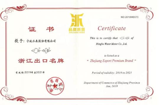 省級(jí)出口名牌是體現(xiàn)外貿(mào)高質(zhì)量發(fā)展的重要標(biāo)志,寧波水表于2015年首獲“浙江出口名牌”榮譽(yù),此次為復(fù)評(píng)通過(guò)。寧波水表近年來(lái)不斷加強(qiáng)品牌建設(shè),持續(xù)擴(kuò)大出口貿(mào)易和對(duì)外交流,充分發(fā)揮自身的品牌優(yōu)勢(shì),致力于發(fā)展成為集智慧計(jì)量與營(yíng)運(yùn)、智慧用水管理、水質(zhì)實(shí)時(shí)監(jiān)控等綜合集成的智慧水務(wù)解決方案提供商,全面提升公司服務(wù)國(guó)內(nèi)外供排水企業(yè)的能力。