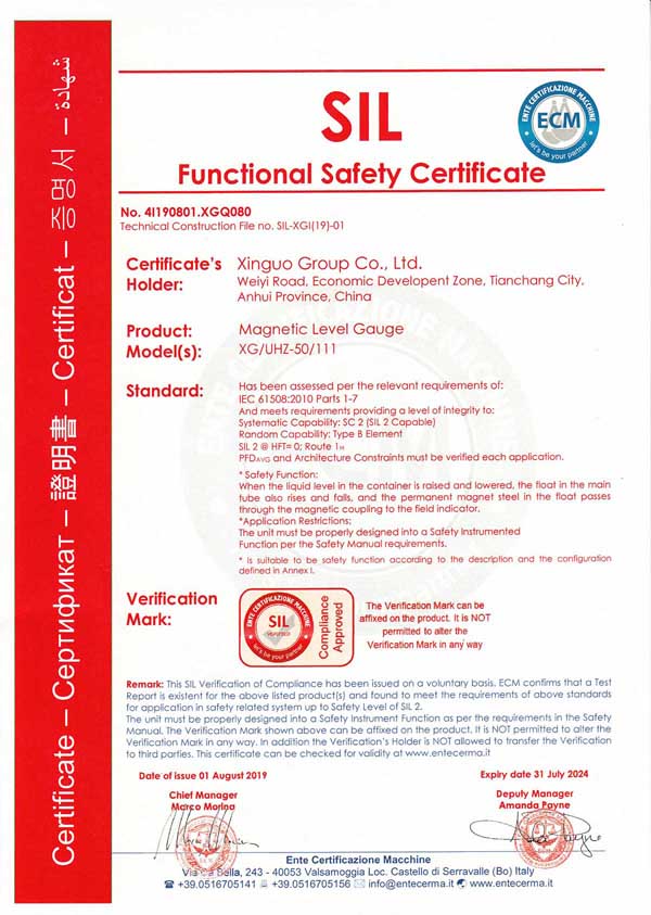 鑫國磁翻板液位計、壓力變送器喜獲SIL安全認證
