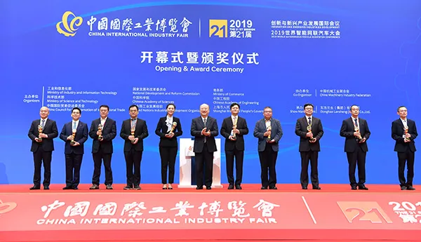 第十屆全國(guó)政協(xié)副主席、中國(guó)工程院原院長(zhǎng)徐匡迪為10家獲獎(jiǎng)單位頒發(fā)“中國(guó)國(guó)際工業(yè)博覽會(huì)大獎(jiǎng)”。中國(guó)工程院院長(zhǎng)李曉紅,上海市委副書記、市長(zhǎng)應(yīng)勇致辭。