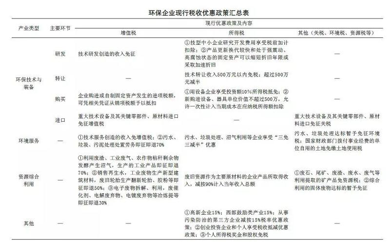 我國環保產業可分為環保技術與設備(產品)、環境服務和資源綜合利用三部分。根據我國現行稅制體系,我國環保企業享受的稅收優惠政策主要包括免稅、即征即退、稅收抵免、稅收減免、加計扣除、減計收入、加速折舊、低稅率等。按照環保產業和稅種分類,我國環保企業稅收優惠政策及其內容如下: