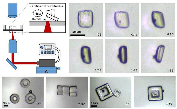 沈陽自動化所微納米課題組針對上述問題利用液體環(huán)境中的氣泡作為微型機器人,對微結構進行三維操作和組裝。科研人員研究了光熱效應產生和控制氣泡的方法,利用氣泡微型機器人對水凝膠微結構進行了多種操作,包括二維移動、旋轉和三維翻轉等,實現(xiàn)了對微結構的三維姿態(tài)控制。綜合上述操作方法,通過氣泡微型機器人可將多個微模塊組裝成復雜的三維結構,為微結構的操作及裝配,體外構建生物組織結構提供了新的解決方案。