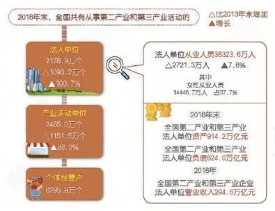 普查報(bào)告顯示,2018年末,全國(guó)共有從事第二產(chǎn)業(yè)和第三產(chǎn)業(yè)活動(dòng)的法人單位2178.9萬(wàn)個(gè),產(chǎn)業(yè)活動(dòng)單位2455.0萬(wàn)個(gè),個(gè)體經(jīng)營(yíng)戶6295.9萬(wàn)個(gè)。2018年末,全國(guó)第二產(chǎn)業(yè)和第三產(chǎn)業(yè)法人單位從業(yè)人員38323.6萬(wàn)人,比2013年末增加2721.3萬(wàn)人,增長(zhǎng)7.6%。其中,第二產(chǎn)業(yè)的從業(yè)人員為17255.8萬(wàn)人,減少2005.0萬(wàn)人,下降10.4%;第三產(chǎn)業(yè)的從業(yè)人員為21067.7萬(wàn)人,增加4726.2萬(wàn)人,增長(zhǎng)28.9%。