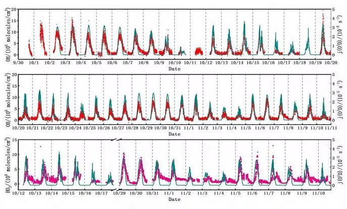 圖3和圖4分別為氣體擴張激光誘導熒光技術系統和外場觀測的HOx自由基濃度數據。由于白天OH自由基的主要來源是臭氧光解,故而可同步測量臭氧的光解速率j(O1D)。未來將進一步發展基于氣體擴張激光誘導熒光技術的地基、機載、船載等多平臺HOx/OH/ROx自由基探測系統,研究對象也逐漸過渡到自由基、反應中間體、反應參數和污染生成潛勢的直接測量,逐步打破現有各種研究手段的界限,通過外場觀測、煙霧箱模擬實驗以及數值模擬,形成基于量化計算和數值模擬引導的外場反應動力學閉合研究。