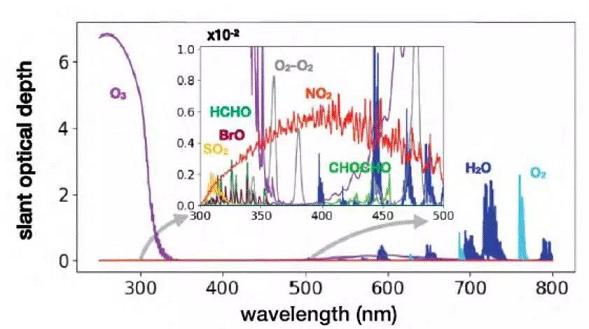 在120公里以下的高空中,除地球大氣的主要組成—氮分子、氧分子和惰性氣體,大氣中還存在著微量痕量氣體。這些痕量氣體雖體積濃度小(不到萬一之一),但能對全球大氣環境及生態產生重大的影響,例如溫室效應、光化學煙霧、臭氧層破壞等。光學/光譜學方法利用光學中的吸收、發射、散射以及大氣輻射傳輸等方法,通過建立特征因子指紋光譜數據庫和定量解析算法,獲取痕量氣體的特性,可用于空氣質量、固定和流動污染源自動監測。圖1為部分痕量氣體在紫外—可見波段的吸收光譜。對于常規氣體,目前的空氣質量監測系統除采用單點測量外,主要利用各種光學技術路線:如針對SO2、NO2、O3及THC、CH4、NMHC、BTX等污染物,差分光學吸收光譜技術(Differential Optical Absorption Spectroscopy,DOAS)利用氣體分子的吸收特性來鑒別成分,并根據窄帶吸收強度反演出微量氣體的濃度,采樣代表性較傳統的點式有較大的改善,有利于對空氣質量的表征;針對溫室氣體CO2,光腔衰蕩光譜技術(Cavity Ring-Down Spectroscopy,CRDS)利用相對較窄的吸收窗口,可以避免其他組分干擾,實現較高精度檢測;針對光化學反應中起關鍵作用的CO,利用可調諧半導體激光吸收光譜技術(Tunable Diode Laser AbsorptionSpectroscopy,TDLAS)的波長調諧特性,用單一窄帶的激光頻率掃描通過氣體分子的一條或者幾條氣體特征吸收線,獲得被測氣體的特征吸收光譜范圍內的吸收光譜,實現CO的定性或定量分析;或者利用光聲光譜技術,根據氣體吸收—強度隨時間變化的光束而被加熱時所引起的一系列聲效應,來獲得氣體的濃度。