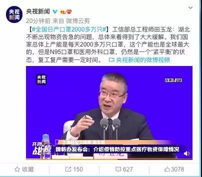 就在昨天的新聞聯播中,國家發改委社會發展司司長接受采訪時也表示,要千方百計做好生活必需品的物資調配保障,推動口罩等生產企業復工達產和擴能以及產品的調配……
