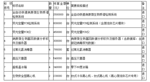 分析測試百科網(wǎng)訊 近日,寧波市疾病預(yù)防控制中心發(fā)布2020年儀器設(shè)備采購項(xiàng)目的采購公告,需采購一批進(jìn)口儀器設(shè)備,包括全自動快速病原微生物質(zhì)譜檢測系統(tǒng),熒光定量PCR,病原微生物基因數(shù)據(jù)分析軟件,生物安全型離心機(jī)等,采購金額近600萬元。