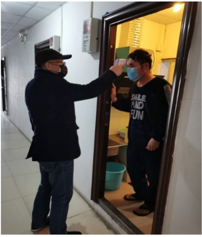 (寧波水表公司周雪峰部長為隔離觀察員工測溫)