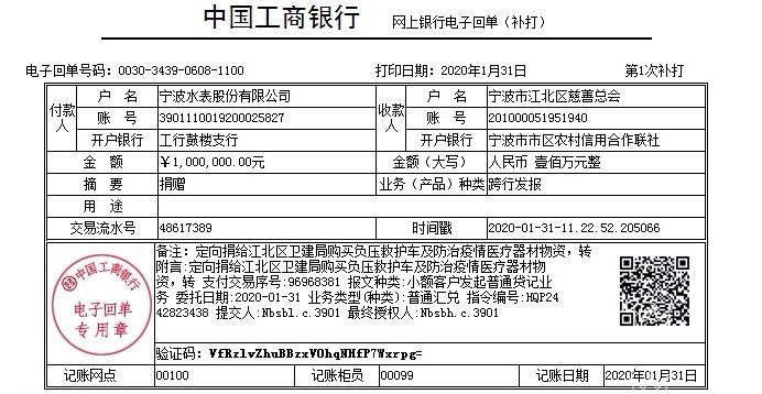 2020年1月31日,寧波水表以公司名義通過江北區(qū)慈善總會向江北區(qū)衛(wèi)生健康局定向捐款100萬元,并于第一時間組織力量采購價值近60萬的KN95防護口罩發(fā)往急需的武漢等地,與此同時,公司員工紛紛援手,多渠道捐款達5萬多元,以實際行動支援全國人民打贏這場沒有硝煙的戰(zhàn)爭。