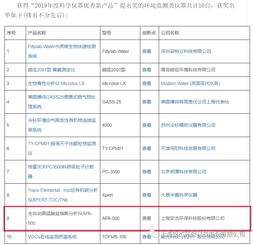 2020年3月11日,2019年度中國科學儀器行業(yè)“優(yōu)秀新品”評選活動“提名獎”揭曉,安杰科技 APA-500 全自動高錳酸鹽指數(shù)分析儀 獲得“2019年度科學儀器優(yōu)秀新產(chǎn)品”提名獎。