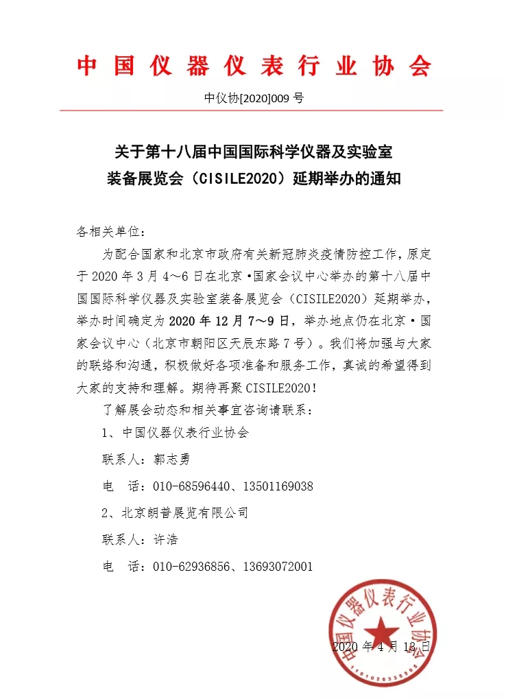 為配合國(guó)家和北京市政府有關(guān)新冠肺炎疫情防控工作,原定于 2020 年 3 月 4~6 日在北京·國(guó)家會(huì)議中心舉辦的第十八屆中國(guó)國(guó)際科學(xué)儀器及實(shí)驗(yàn)室裝備展覽會(huì)(CISILE2020)延期舉辦,舉辦時(shí)間確定為 2020 年 12 月 7~9 日,舉辦地點(diǎn)仍在北京·國(guó)家會(huì)議中心(北京市朝陽區(qū)天辰東路 7 號(hào))。我們將加強(qiáng)與大家的聯(lián)絡(luò)和溝通,積極做好各項(xiàng)準(zhǔn)備和服務(wù)工作,真誠(chéng)的希望得到大家的支持和理解。期待再聚 CISILE2020!