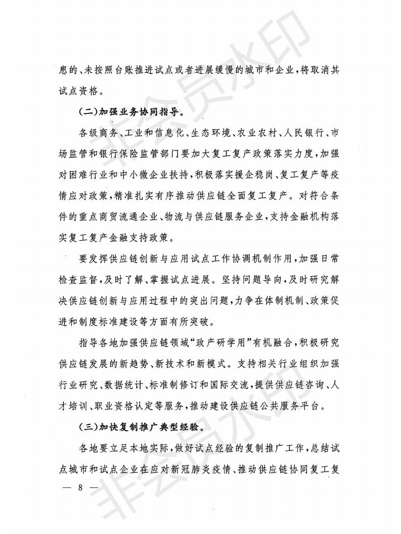 通知要求,試點城市要落實分區分級精準防控和精準復工復產要求,加快推動和幫助供應鏈龍頭企業和在全球供應鏈中有重要影響的企業復工復產;試點企業要勇擔社會責任,充分發揮龍頭帶動作用,加強與供應鏈上下游企業協同,協助配套企業解決技術、設備、資金、原輔料等實際困難。