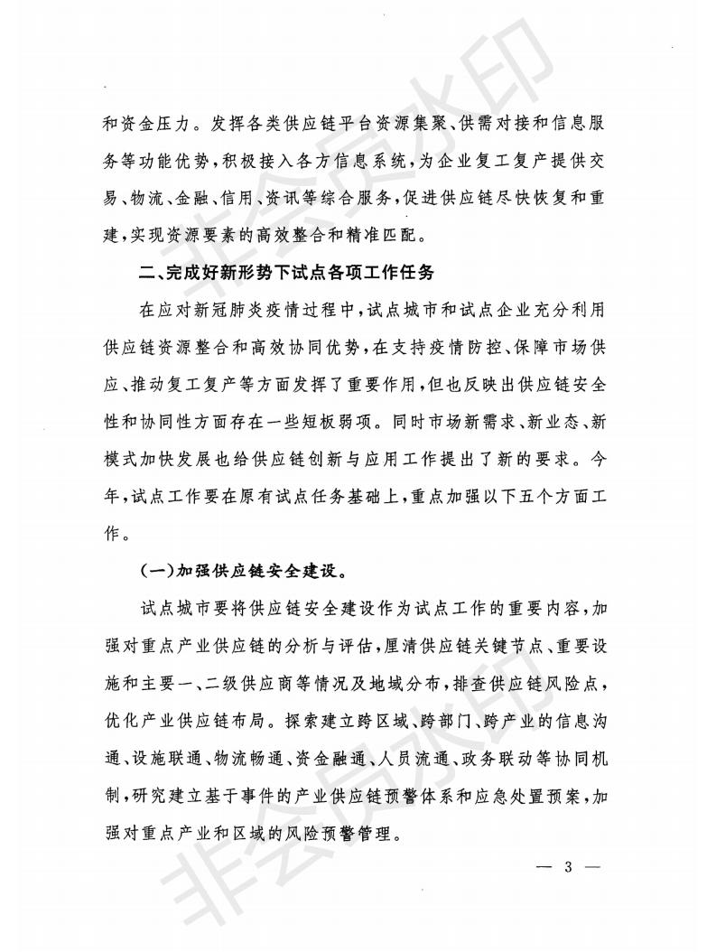 通知指出,為認真貫徹落實打贏脫貧攻堅戰、全面建成小康社會重大戰略部署和堅持在常態化疫情防控中加快推進生產生活秩序全面恢復相關要求,針對供應鏈安全性和協同性方面存在的短板弱項,積極應對市場新需求、新業態、新模式加快發展給供應鏈創新與應用工作提出的新要求,要在原有試點任務基礎上,重點做好加強供應鏈安全建設、加快推進供應鏈數字化和智能化發展、促進穩定全球供應鏈、助力決戰決勝脫貧攻堅和充分利用供應鏈金融服務實體企業等五個方面工作。