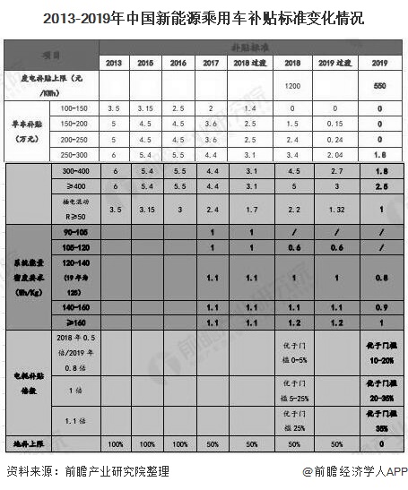 2013-2019年中國(guó)新能源乘用車(chē)補(bǔ)貼標(biāo)準(zhǔn)變化情況