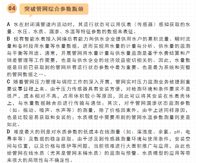 寧水集團2019年初在主板A股上市后,進一步確立了服務于智慧供水新業務的戰略方針與目標,在持續做好水表產品水計量性能提升、以NB-IoT及5G技術等為代表的無線數據遠傳業務拓展以及DMA分區計量漏損監測、水務信息化應用等工作基礎上,正在努力向供水管網數據綜合提供商和智慧供水核心業務服務商轉型與升級,其近中期目標是向供水企業提供在線一體化的高性價比管網綜合大數據感知裝置(包括:水量、水壓、水質、漏滲、水溫等參數),為智慧供水新業務及水務信息化云平臺提供海量數據支撐,使現有水力、水質、漏損、能耗等水務管網模型運行準確度能夠顯著提升。