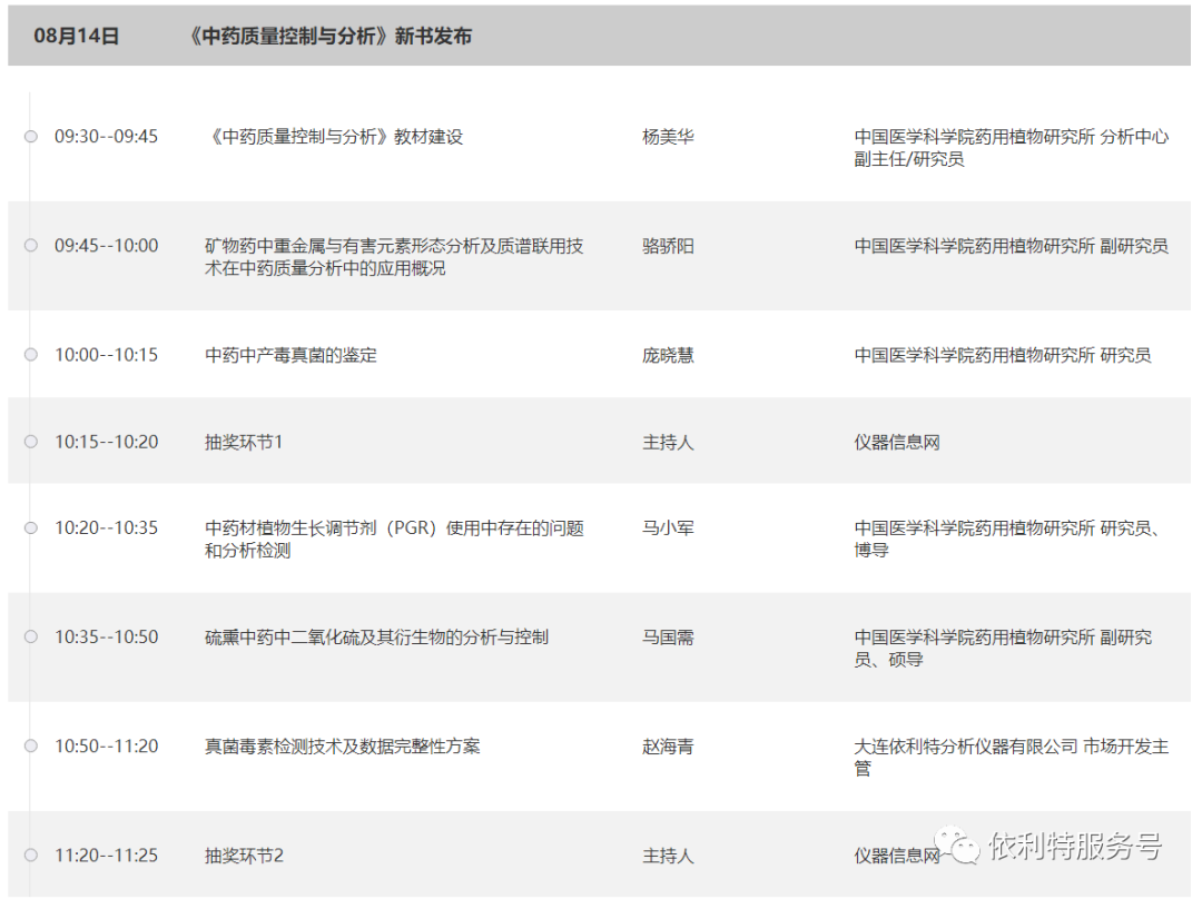 2、關(guān)注【依利特服務(wù)號】,獲得會后回放視頻、并有機(jī)會獲得《中藥質(zhì)量控制與分析》新書。