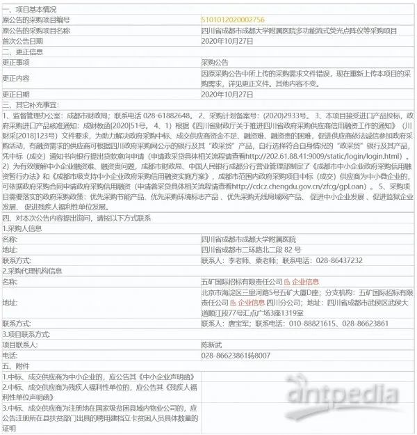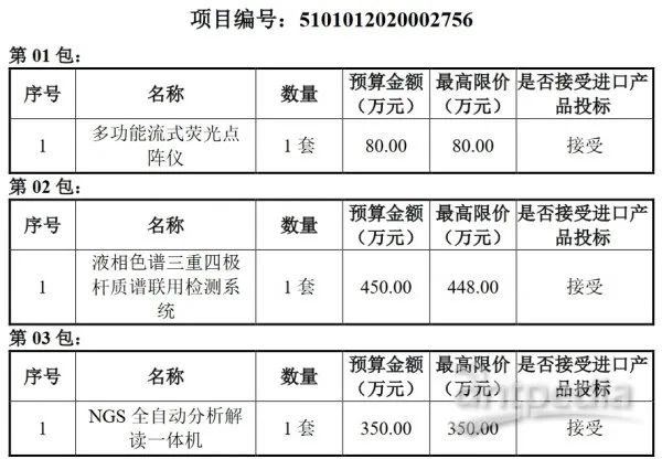 近日,四川省成都市成都大學附屬醫院發布一則招標公告,欲購買多功能流式熒光點陣儀、液相色譜三重四極桿質譜聯用檢測系統和NGS全自動分析解讀一體機儀器。以下為采購詳情: