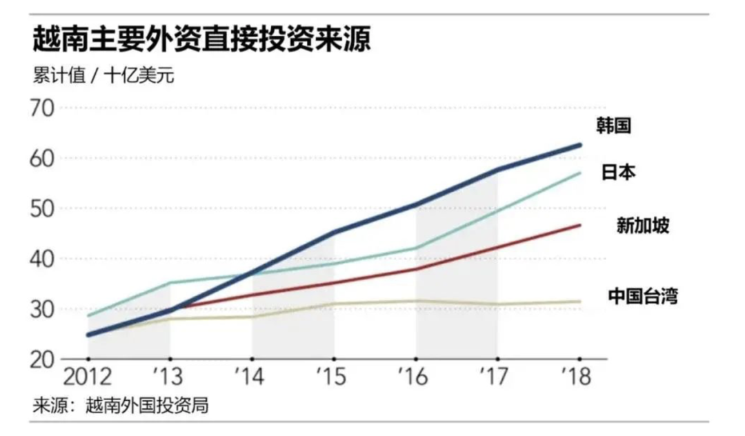 東亞金融危機后,日本經濟總量原地打轉了整整近20年,而韓國卻從尸山血海中爬起來后,開始迅猛增長,超過俄羅斯成為了世界第八大工業(yè)國,人均GDP也達到了日本的7成。但狹小的韓國本土無法承載迅猛崛起的韓國企業(yè),南下成為了必然的選擇。2014年,韓國超越日本,成為越南最大的FDI來源國。