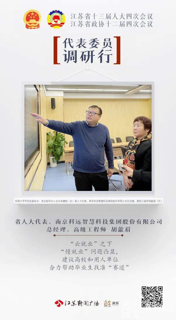 就業是經濟的“晴雨表”,是民生的“壓艙石”。疫情防控常態化背景下,高校畢業生的就業問題是當前也是未來一段時間的工作重點之一。在省兩會召開前夕,省人大代表、科遠智慧總裁胡歙眉前往東南大學就業指導中心進行調研。