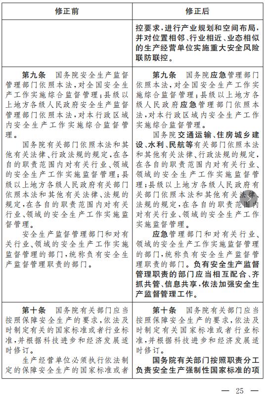 (二)將第九條第三款修改為:“應(yīng)急管理部門和對有關(guān)行業(yè)、領(lǐng)域的安全生產(chǎn)工作實施監(jiān)督管理的部門,統(tǒng)稱負(fù)有安全生產(chǎn)監(jiān)督管理職責(zé)的部門。負(fù)有安全生產(chǎn)監(jiān)督管理職責(zé)的部門應(yīng)當(dāng)相互配合、齊抓共管、信息共享,依法加強(qiáng)安全生產(chǎn)監(jiān)督管理工作。”